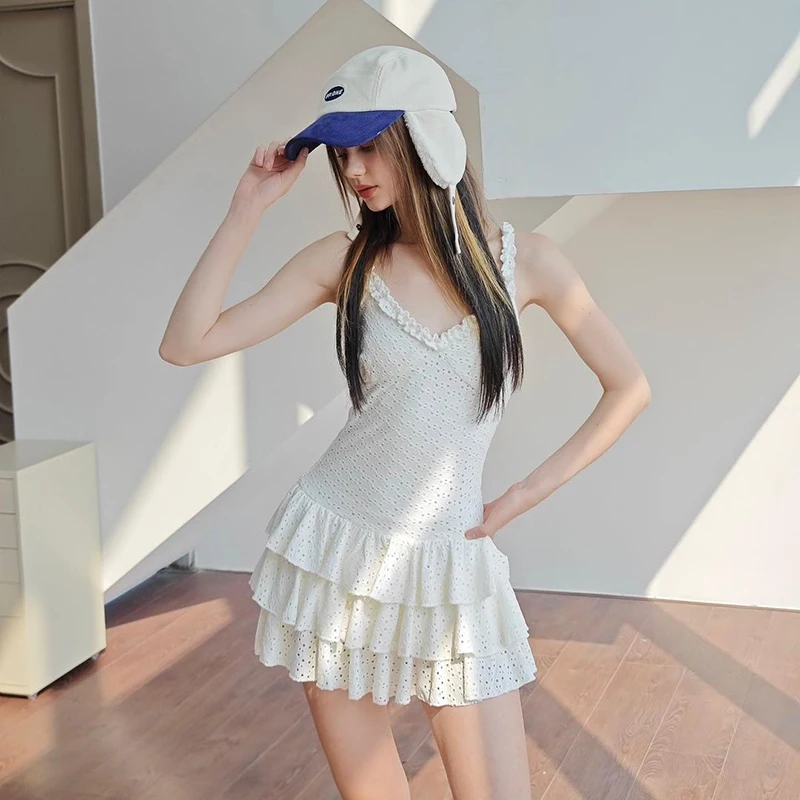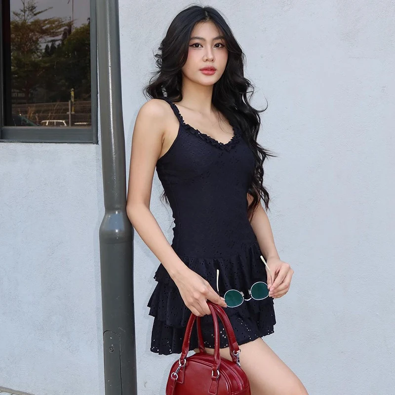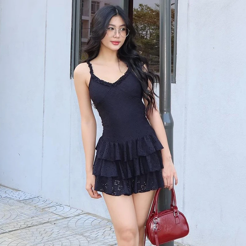 Women Mini Dress Summer New Solid V-Neck Fashion Pleated Sexy Sleeveless Straps A-Line Dress Streetwear Casual Slim Lady Dresses